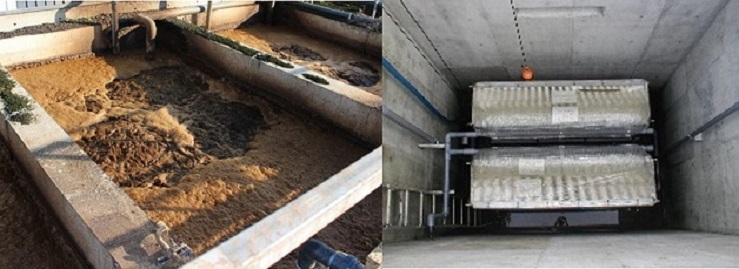 生物処理を行う活性汚泥槽です。硝化槽(好気槽)と脱窒槽(無酸素槽)を配置し、BOD成分を除去します。 また、メタノール添加により、不足したBOD成分を添加することで、脱窒素を促進させます。