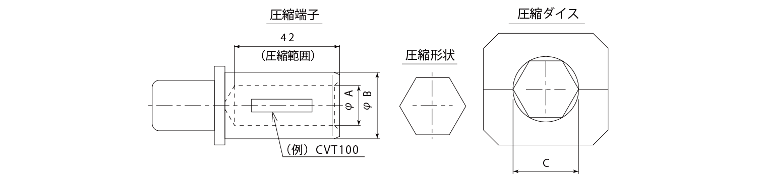 | 適用ケーブルサイズ | 寸法 | 圧縮ダイス対角寸法C | |